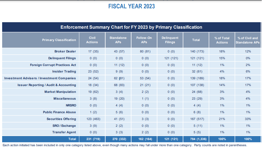 Ketua SEC, Gary Gensler, mengungkapkan tahun fiskal 2023 merupakan tahun yang sangat produktif terhadap upaya penegakan di bidang sekuritas aset kripto. Sepanjang periode tersebut, SEC telah memberikan rekomendasi tindakan untuk mengatasi berbagai dugaan pelanggaran kripto; meliputi penipuan bernilai miliaran dolar AS, penawaran sekuritas tak berizin hingga aktivitas pemasaran yang dilakukan oleh tokoh publik secara ilegal.
