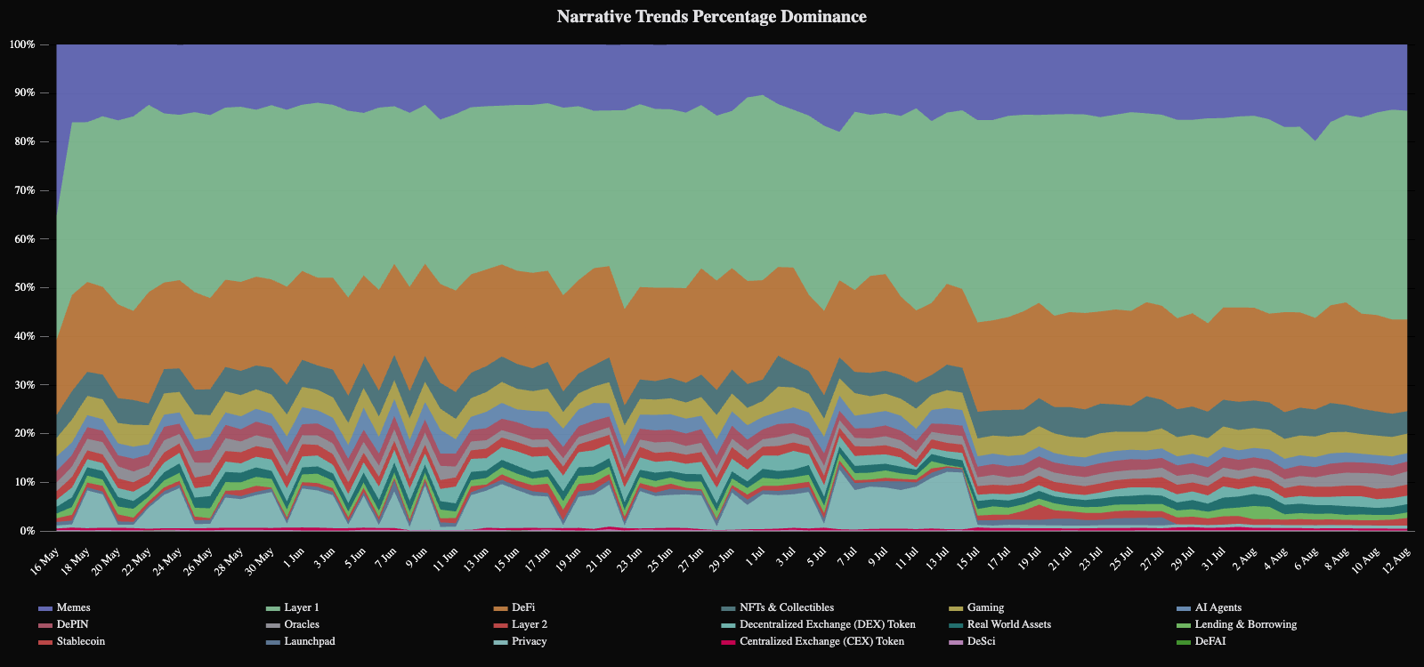 Meski potensi DePIN kuat, popularitasnya tidak. Menurut data dari Sharpe AI, selama tiga bulan terakhir, layer-1, DeFi, meme coin, dan aset dunia nyata terus mendominasi diskusi kripto. Sebaliknya, DePIN masih sedikit tertinggal dalam daftar ini.