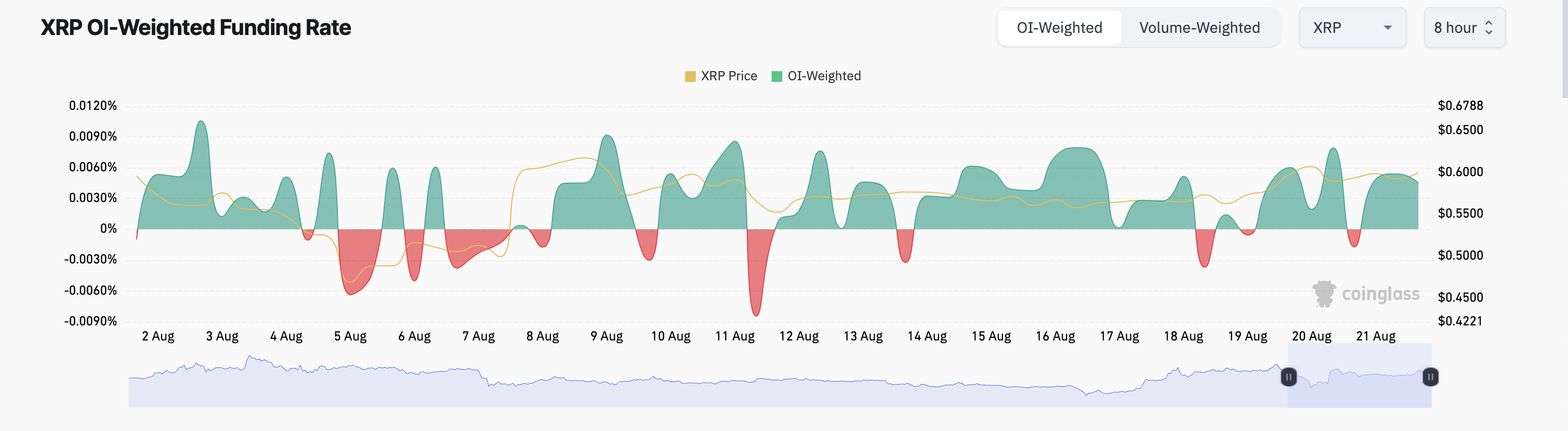 Saat ini, altcoin ini diperdagangkan seharga US$0,59, mencerminkan apresiasi harga 1% dalam 24 jam terakhir. Yang menarik, trader futures tetap bullish; mayoritas masih mempertahankan posisi long. Ini terpampang pada funding rate positif token di crypto exchange. Tepatnya, funding rate XRP saat ini ada di level 0,0045%.