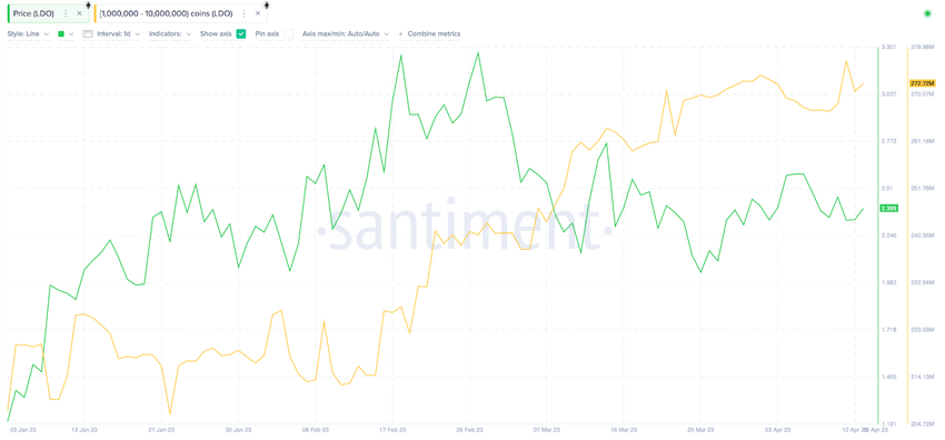 Dalam beberapa minggu terakhir ini, koin LDO telah mengalami peningkatan momentum pembelian dari para crypto whale yang memegang jutaan hingga 10 juta LDO. Grafik di bawah ini menunjukkan bagaimana kalangan whale membeli hampir 33 juta token antara tanggal 5 Maret dan 12 April. Pada saat publikasi, yaitu ketika valuasi pasar bernilai US$2,39, token yang terakumulasi bernilai sekitar US$80 juta.