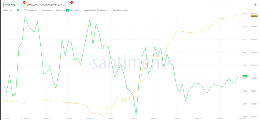 Kendati OP mengalami kinerja yang naik turun dalam seminggu terakhir, tetapi data on-chain-nya menunjukkan bahwa kalangan crypto whale tetap optimis. Buktinya, antara 1 Maret dan 12 April, para whale dengan saldo wallet 1 juta – 10 juta OP telah menambahkan 256 juta token lagi.
