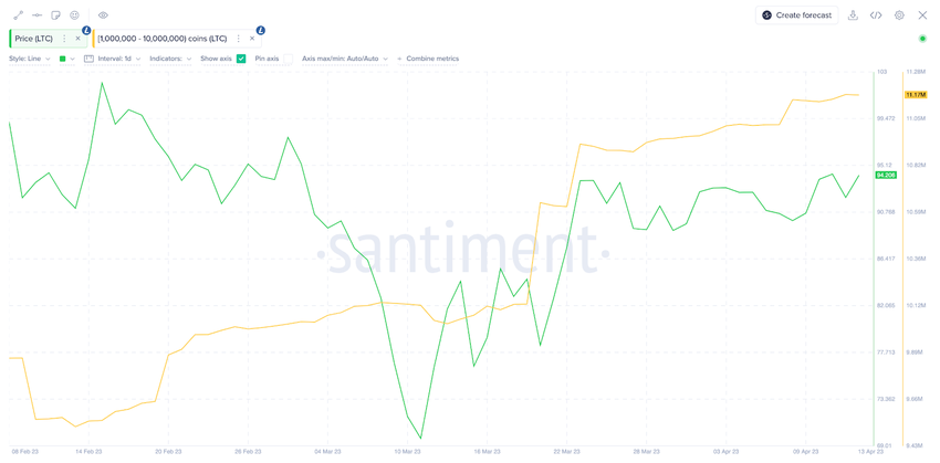 Pada 15 Februari, Litecoin secara singkat breakout di atas US$100 untuk pertama kalinya sejak Mei 2022. Namun, reli tersebut tidak berumur panjang, dan pada tanggal 11 Maret harga LTC kembali ambles di bawah US$70. Menariknya, volatilitas ini tidak menyurutkan minat kelompok crypto whale yang memegang 1 juta hingga 10 juta koin LTC.