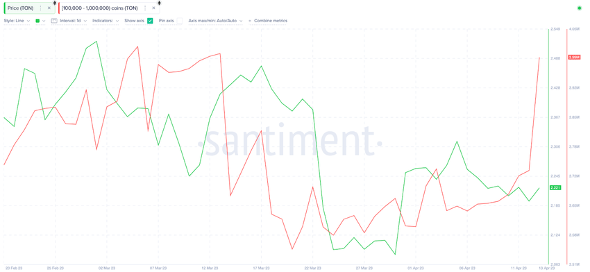 Menurut perusahaan forensik blockchain Santiment, holder whale TON kembali berada dalam mode akumulasi setelah memetik profit pada awal Maret. Antara tanggal 20 Maret dan 13 April, kelompok whale dengan saldo individu 100.000 – 1 juta TON menambahkan 44 juta koin lagi.