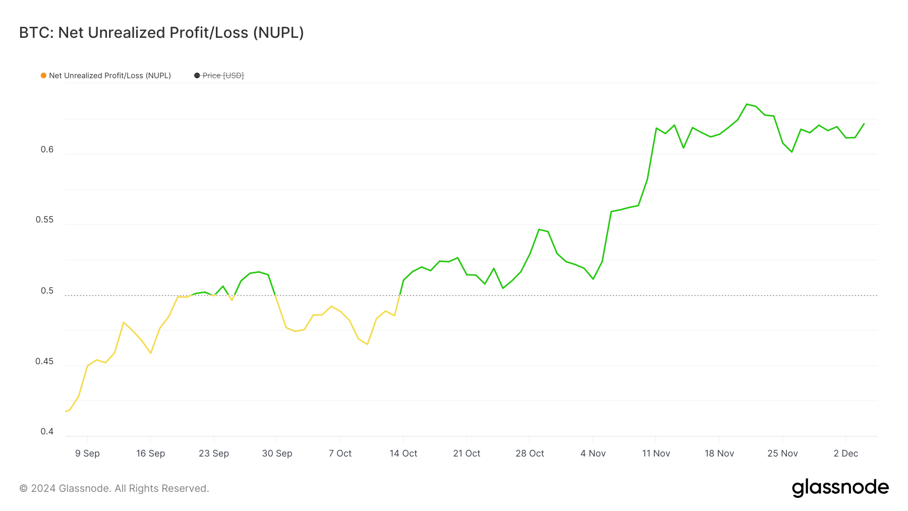 Grafik NUPL Bitcoin menunjukkan NUPL-nya saat ini berada di 0,62, atau turun tipis dari 0,63 beberapa hari yang lalu. NUPL (Net Unrealized Profit/Loss) sendiri bertugas mengukur proporsi peserta pasar yang untung dibandingkan dengan yang rugi. Sehingga, ini bisa memberikan wawasan tentang sentimen pasar.