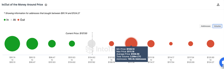 Nah, jika tren historis ini berulang, itu artinya Litecoin masih punya peluang untuk naik hingga US$120 menjelang halving kali ini. Namun, resistance yang menghadang di level US$110 bisa menjadi tantangan berat. Seperti yang terlihat di bawah ini, sekitar 200.000 investor telah membeli 2,09 juta koin LTC dengan harga rata-rata US$109,56.
