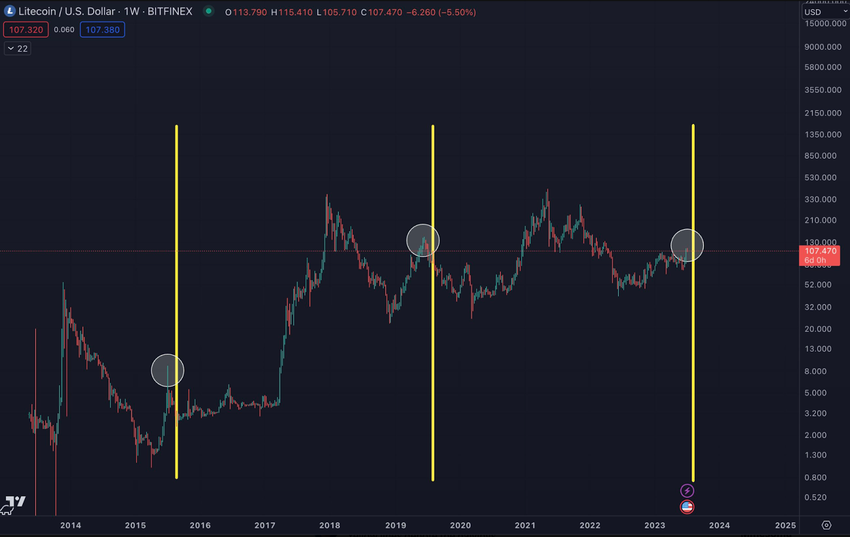 Sebagai informasi, halving Litecoin berlangsung setiap 4 tahun sekali. Melalui grafik di atas, Benjamin Cowen memberikan proyeksi bullish dengan menyoroti titik-titik di mana harga LTC telah mencapai puncak menjelang dua siklus halving sebelumnya pada 2015 dan 2019.