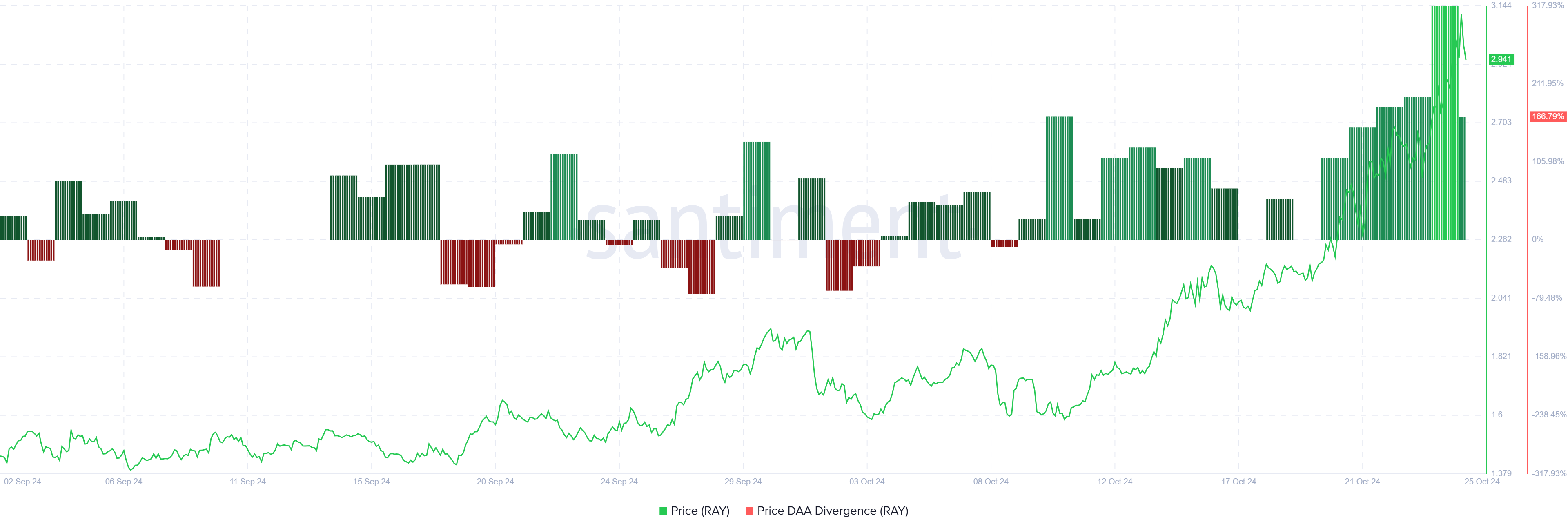 Adapun melambungnya partisipasi investor di Raydium serta harga yang meroket selanjutnya memberikan kontribusi pada lanskap pasar yang mendukung, di mana DAA divergence semakin memperkuat tren naik. Keselarasan antara aksi harga dan keterlibatan pengguna ini bisa memberi stabilitas yang RAY perlukan untuk menembus level resistance baru.
