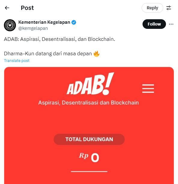 Nama Adab dalam platform tersebut merupakan akronim dari Aspirasi, Desentralisasi dan Blockchain. Kun sebagai Calon Wakil Gubernur yang mendampingi Dharma mengatakan pihaknya berkomitmen untuk menerapkan pemerintahan yang lebih terbuka, jujur dan trusted melalui blockchain.