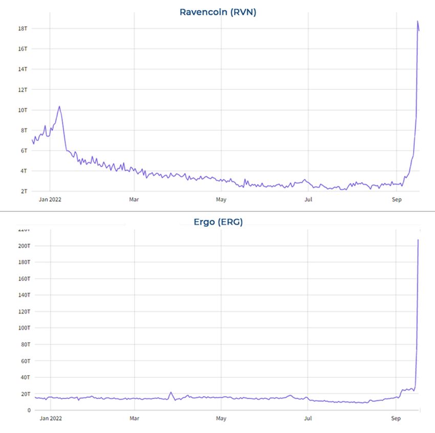 Dengan kesuksesan The Merge di Ethereum, para miner alias penambang kripto kini berpindah ke jaringan blockchain lain untuk melanjutkan operasinya. Perpindahan tersebut secara khusus tercermin dari peningkatan tajam hashrate di jaringan Ravencoin dan Ergo.