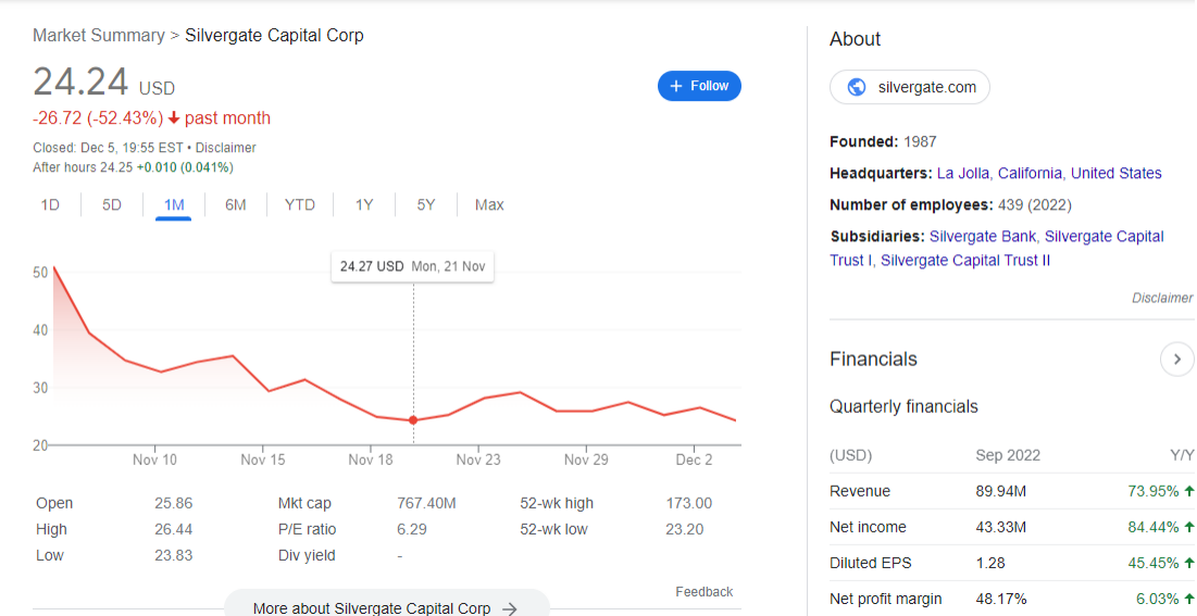 Pada penutupan perdagangan di Senin (5/12), harga saham perusahaan turun 8,49% ke level US$24,24. Padahal, pada awal pembukaan perdagangan, harga saham Silvergate Capital masih berada di level US$25,85 per saham.