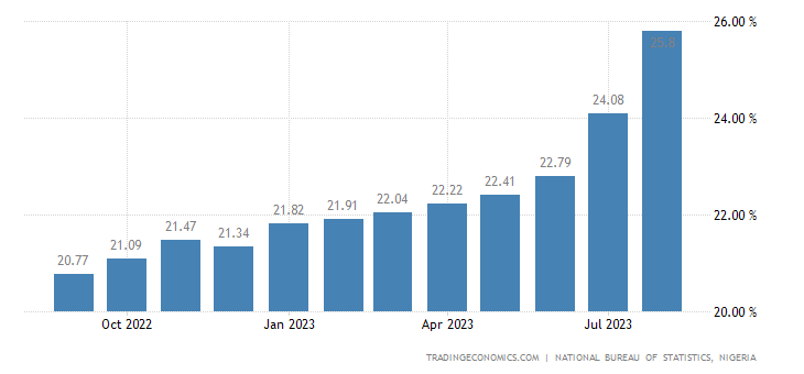 SponsoredNigeria sendiri tercatat memiliki laju inflasi sebesar 25,8% di Agustus kemarin. Berdasarkan data Trading Economics, angka itu terus menanjak sejak Januari 2023. Tepatnya, mulai dari 21,82% di awal tahun, kemudian 22,22% di April, dan menjadi 24,08% pada Juli lalu.