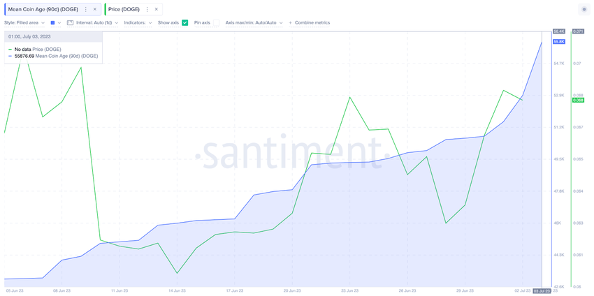 Sejak tergelincir ke titik terendahnya baru-baru ini sebesar 43.107 pada 7 Juni, Mean Coin Age DOGE tercatat telah melejit 30% menjadi 55.876 pada 3 Juli.