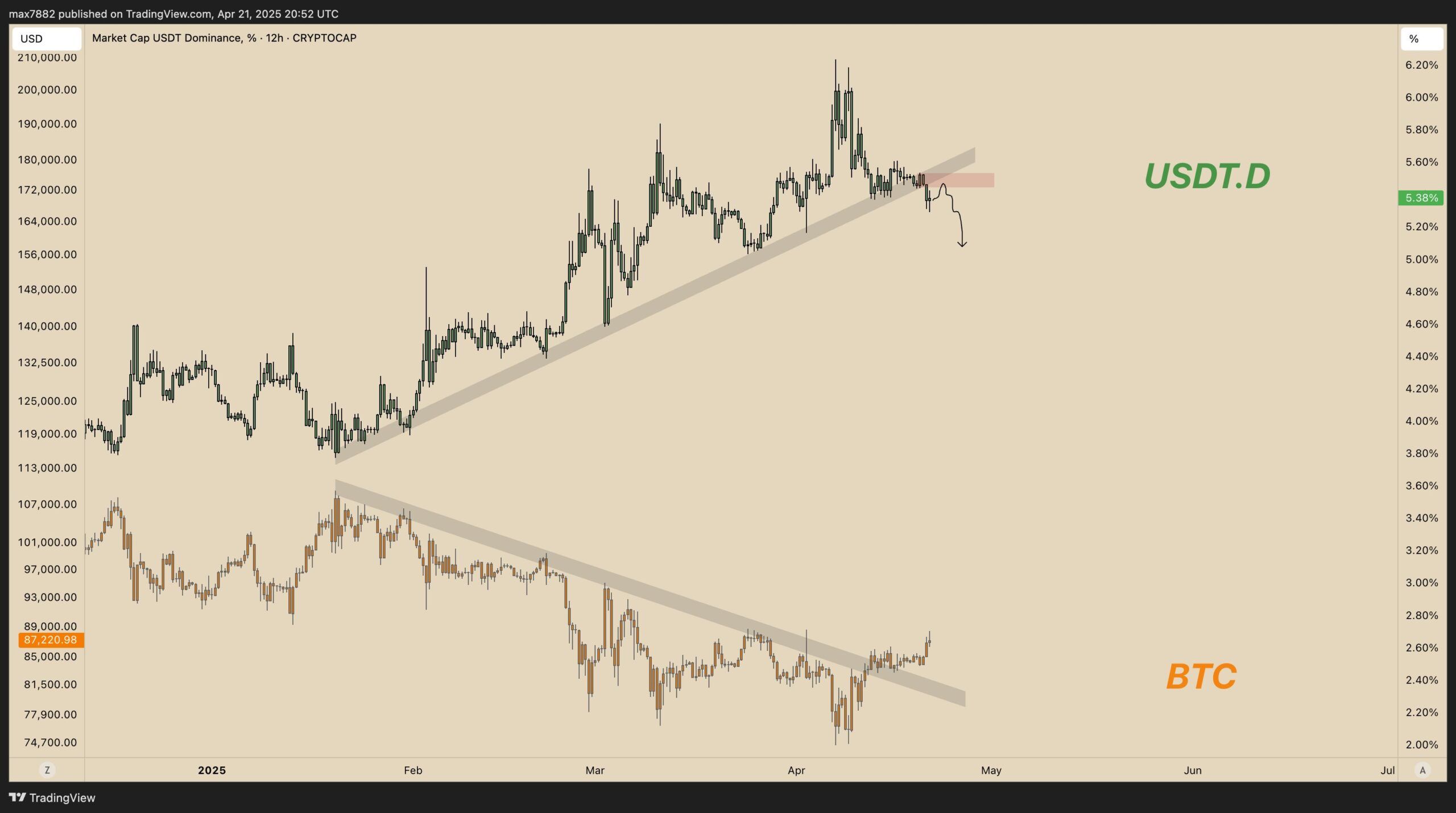 Tether mencetak lebih dari US$1,6 miliar hanya dalam bulan April. Prestasi ini membawa Tether lebih banyak beredar. Jika kapitalisasi pasar USDT menggambarkan modal yang tersedia di pasar, maka USDT.D berfungsi sebagai indikator awal apakah modal tersebut mulai mengalir ke altcoin dan Bitcoin.
