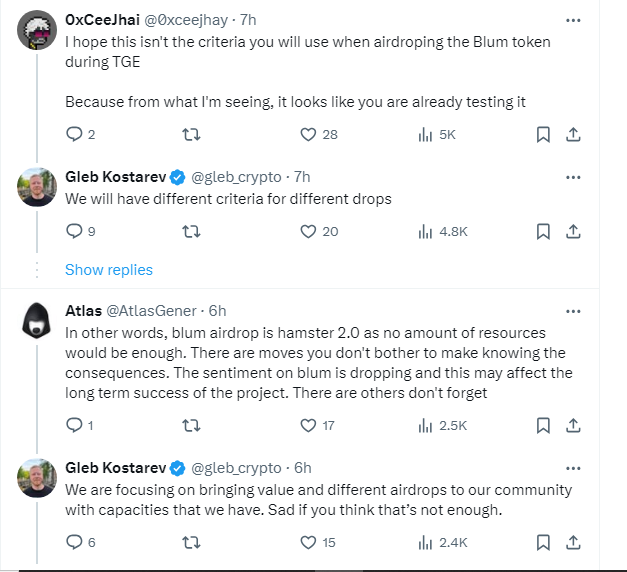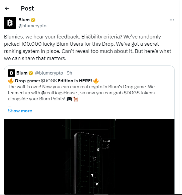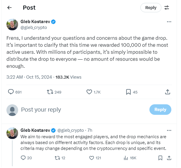 Salah satu pendiri sekaligus CEO Blum, Gleb Kostarev ikut turun ke X dan menjelaskan bahwa pihaknya memiliki keterbatasan sumber daya untuk bisa menyalurkan hadiah Drop Game. Skema ini segaja dipilih untuk bisa memberikan penghargaan kepada pemain yang paling terlibat.