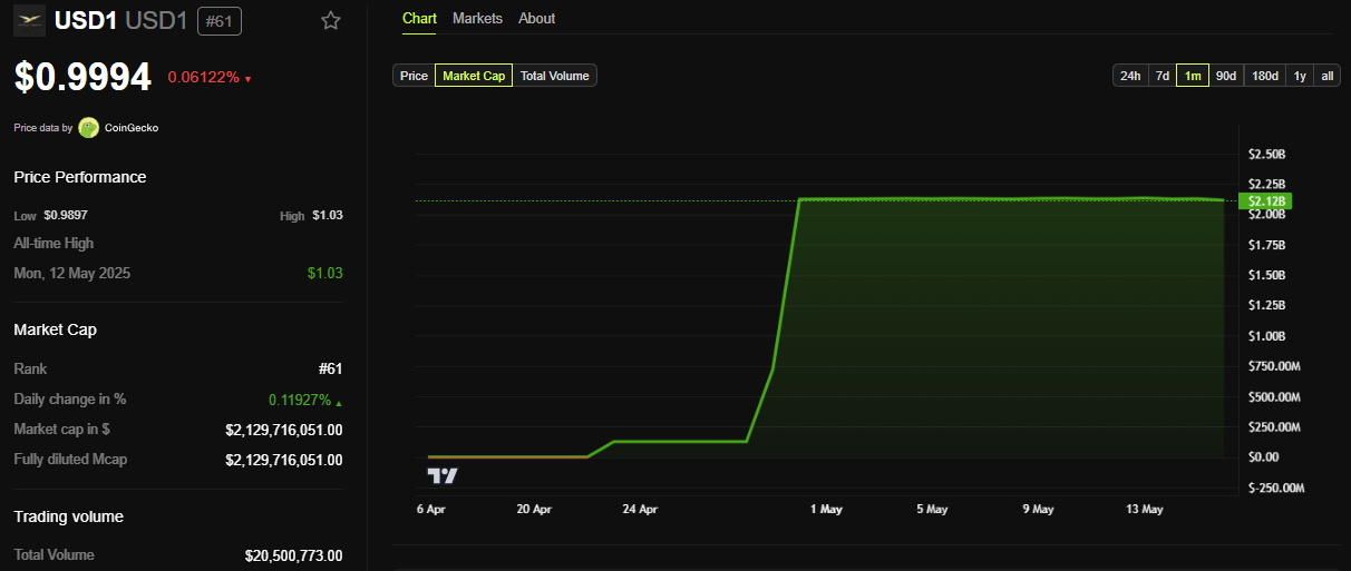 Diluncurkan hanya dua bulan lalu, stablecoin USD1 dengan cepat mendapatkan perhatian. Pada awal Mei, kapitalisasi pasarnya melampaui US$2 miliar dan mencapai US$2,129 miliar pada waktu publikasi.