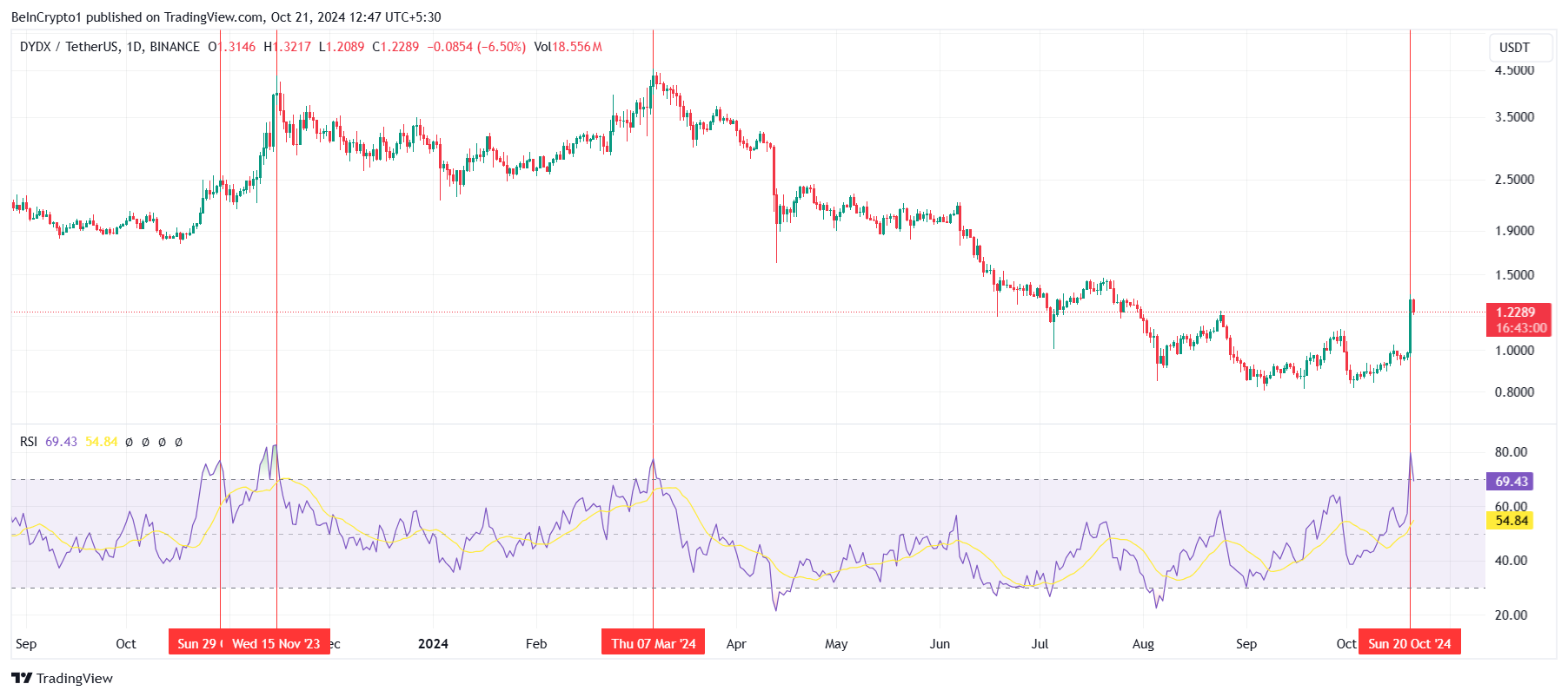 Dari sudut pandang teknis, momentum DYDX terlihat rapuh. Indeks Kekuatan Relatif (RSI), indikator penting kondisi overbought dan oversold, saat ini berada di zona overbought.