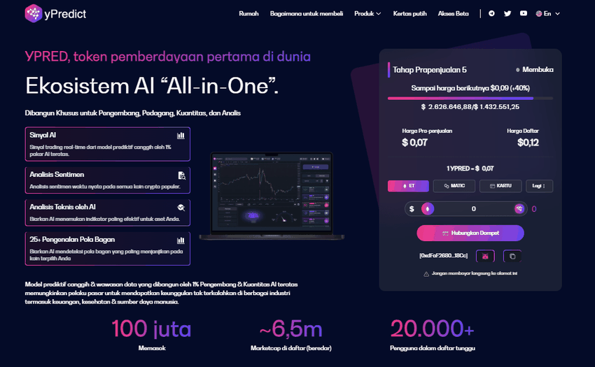 yPredict memanfaatkan kecerdasan buatan (AI) untuk menyediakan riset dan analisis komprehensif kepada pengguna, dan saat ini berada di tahap presale.