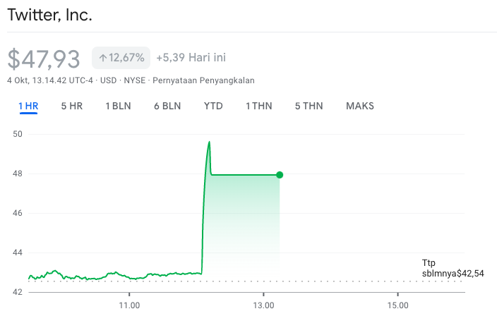 Atas kabar ini, harga saham Twitter naik sebanyak 12,67% dan sejak itu perdagangan saham dengan kode TWTR itu dihentikan. Tidak hanya harga saham Twitter yang melesat, harga kripto Dogecoin (DOGE) yang kerap kali dipromosikan Elon Musk juga melonjak tajam.