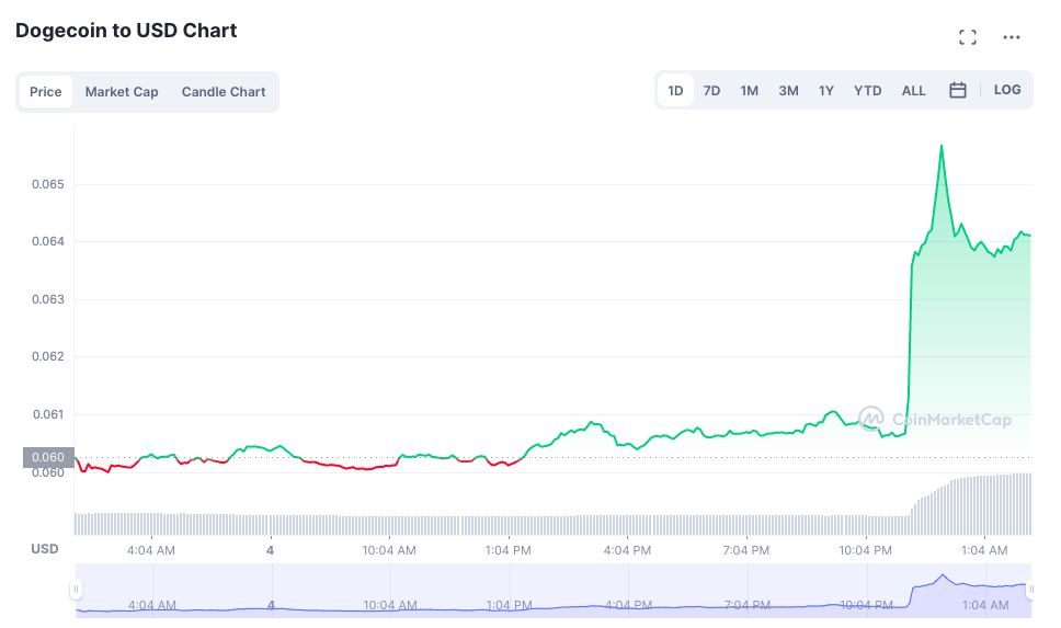 Artinya, sentimen perkembangan terbaru ‘akuisisi Twitter oleh Elon Musk’ membuat harga DOGE sempat naik sekitar 8%. Pada hari Rabu (5/10) pukul 02:10 WIB, volume perdagangan DOGE terus meningkat mencapai US$628,81 juta, meski harganya telah melorot ke level US$0,064.