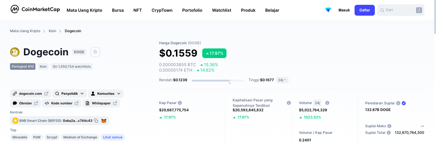 Dalam 24 jam terakhir, harga Dogecoin (DOGE) terpantau naik di atas 17% menjadi sekitar Rp2.249 (sekitar US$0,1559) dan volume perdagangan meroket 1.022% menjadi Rp72,43 triliun (US$5 miliar).