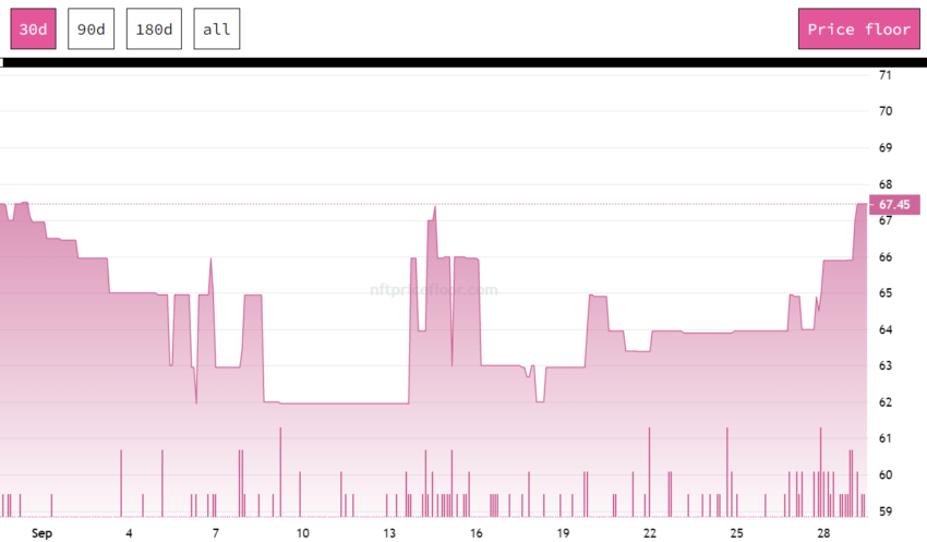 Menurut data dari NFT Price Floor, harga dasar CryptoPunks saat ini adalah 67,45 ETH dan volume perdagangan 24 jam berjumlah 4,312,3 ETH, dengan total 15 penjualan. Sementara itu, dalam 24 jam terakhir, harga dasar CryptoPunks telah naik 2,37%.