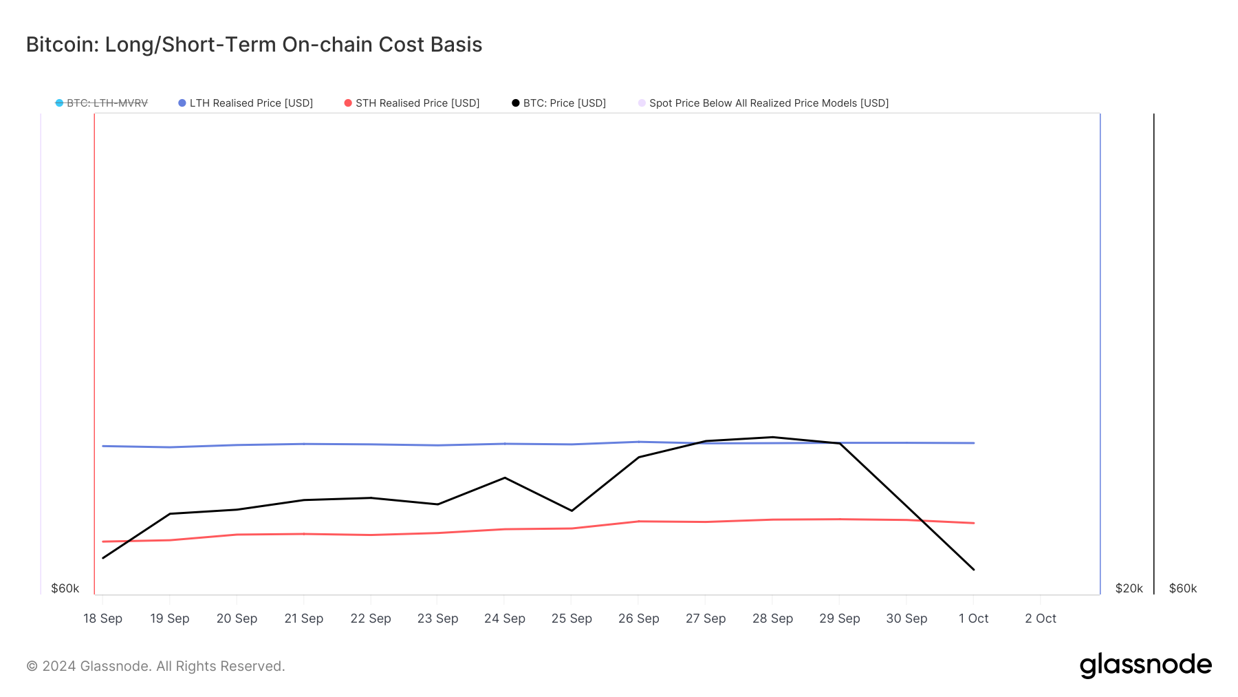 Di tengah sentimen negatif, harga Bitcoin terperosok ke bawah Short-Term Holder (STH) Realized Price, yakni rata-rata biaya akuisisi on-chain dalam 155 hari terakhir.