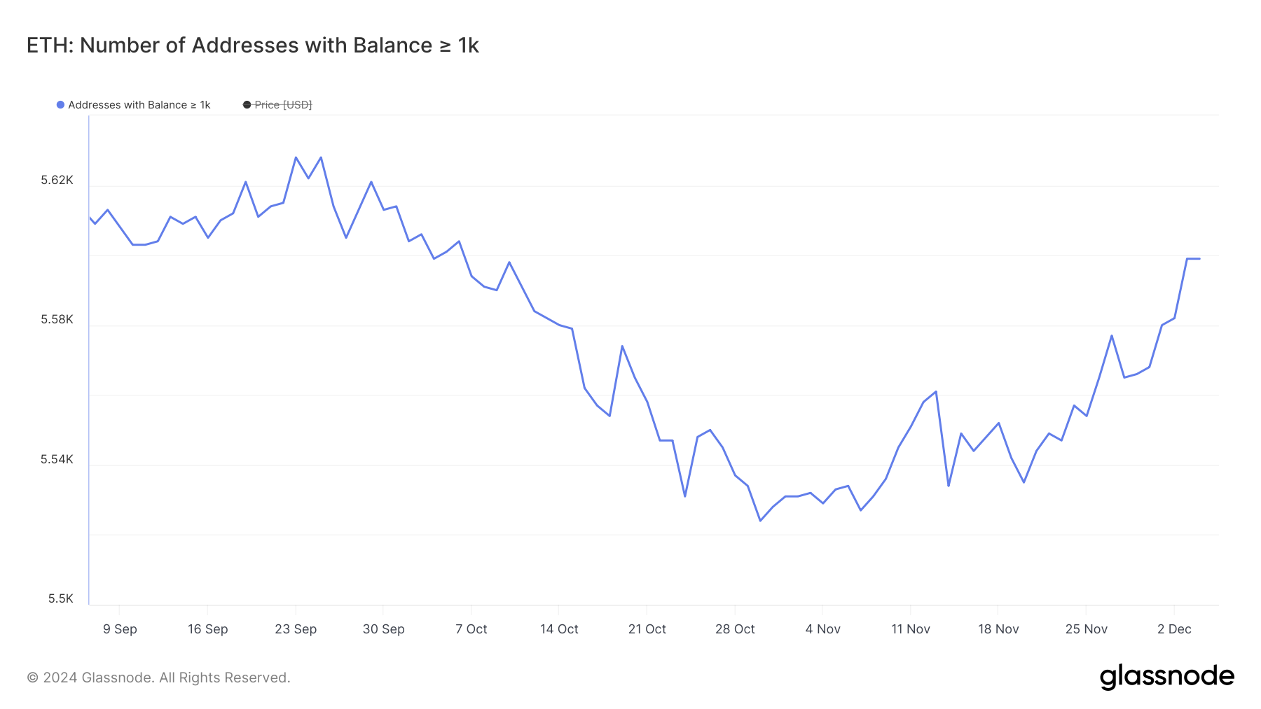 Jumlah dompet yang memegang setidaknya 1.000 ETH mencapai titik terendah 3 bulan di 5.524 pada 30 Oktober tetapi sejak itu berbalik arah, menunjukkan akumulasi baru. Pada 3 November, metrik ini naik menjadi 5.599, nilai tertinggi sejak 6 Oktober.