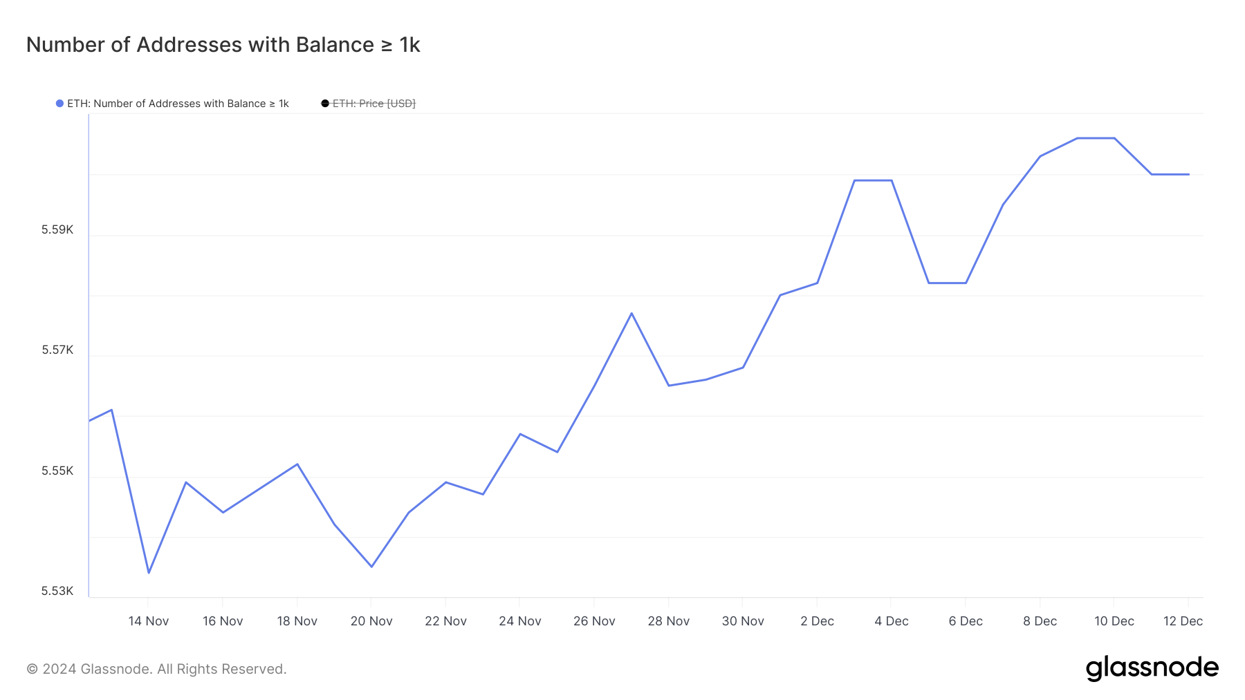 Jumlah whale Ethereum yang memegang setidaknya 1.000 ETH terus meningkat sejak pertengahan November, naik dari 5.534 pada 14 November menjadi 5.600 saat ini. Tren ini menyoroti akumulasi konsisten oleh holder besar, yang dapat memberikan wawasan berharga tentang dinamika pasar.