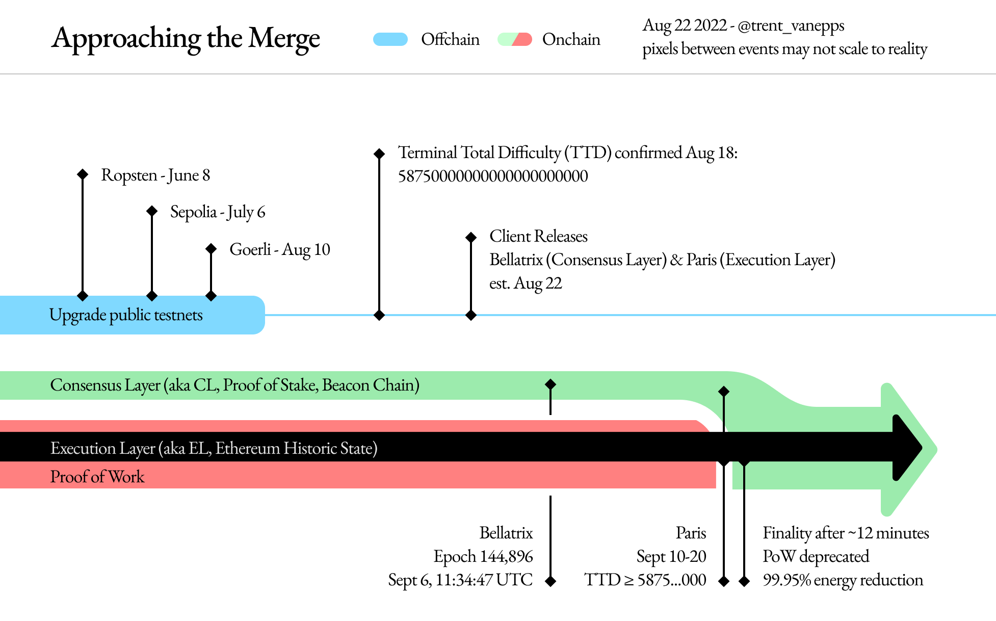 Skenario pertama yang dijelaskan dalam dokumen itu dimulai dengan peningkatan Bellatrix pada 1 September, dengan The Merge terjadi 2 minggu kemudian pada atau sekitar 15 September. Skenario kedua akan melihat Bellatrix ditingkatkan pada 6 September, dengan The Merge terjadi pada atau sekitar 20 September. Mengingat bahwa tanggal upgrade Bellatrix yang disukai adalah 6 September, maka skenario kedua lebih mungkin.