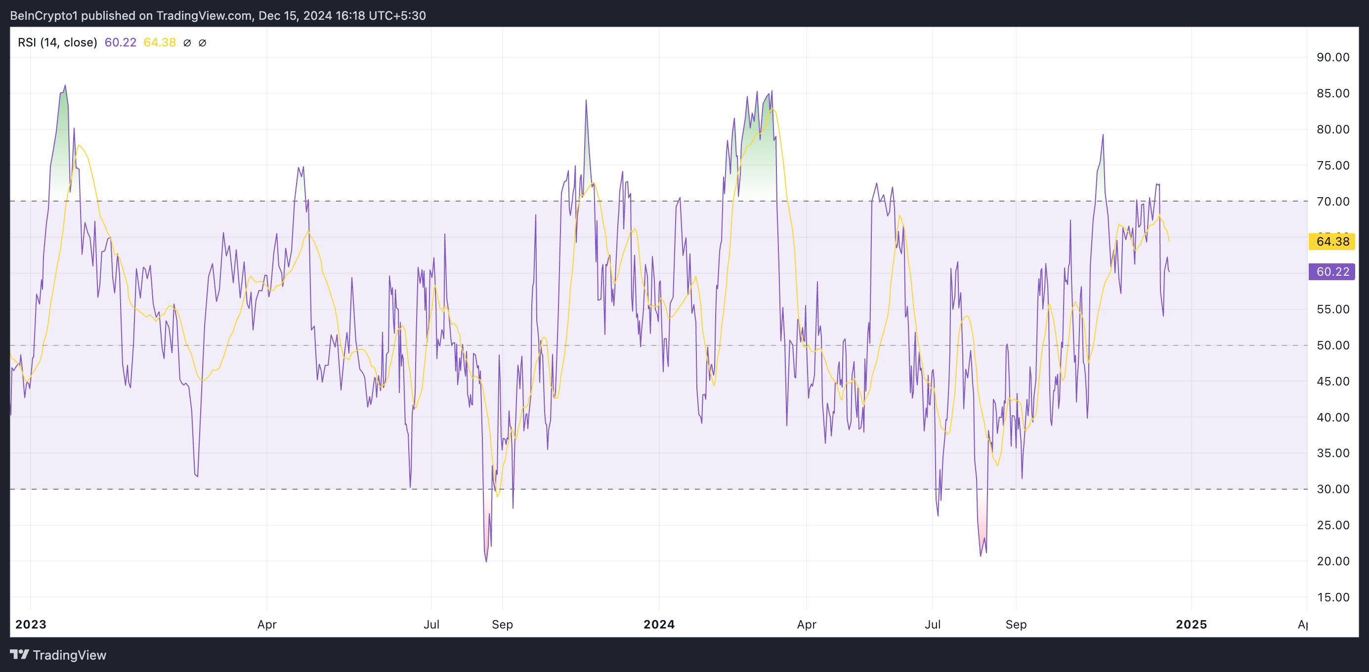 Selain itu, Relative Strength Index (RSI) koin ini berada di angka 60,22, menunjukkan permintaan yang stabil untuk altcoin terkemuka ini. Indikator ini mengukur kondisi pasar aset yang overbought dan oversold. Dengan rentang dari 0 hingga 100, nilai di atas 70 menandakan kondisi overbought dan potensi penurunan harga, sementara nilai di bawah 30 menunjukkan kondisi oversold, yang menyarankan kemungkinan rebound.