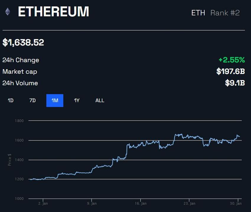 Pada hari berita ini dipublikasikan, harga ETH naik 2,6%. Alhasil, aset tersebut diperdagangkan seharga US$1.638 pada dini hari tanggal 30 Januari.