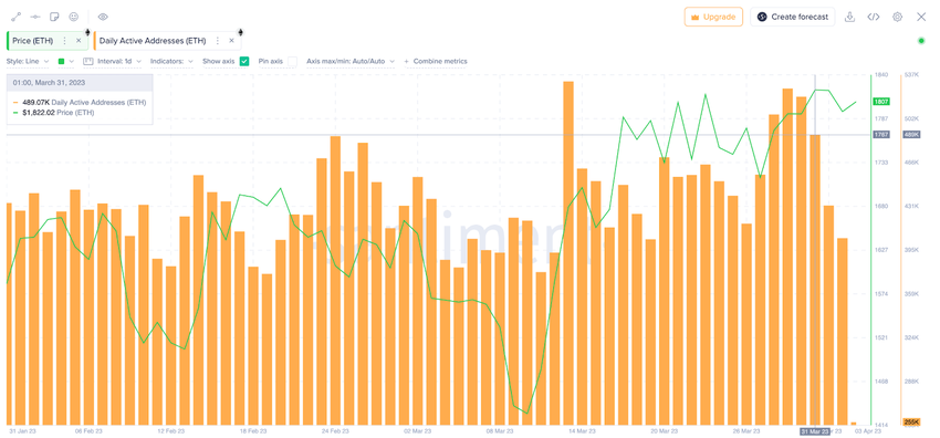 Menurut Santiment, jumlah alamat yang berinteraksi di jaringan Ethereum pada Maret 2023 mengalami peningkatan yang signifikan dibandingkan bulan Februari lalu. Pada tanggal 4 Maret, daya tarik harian (daily traction) Ethereum sempat mencapai level terendah lokalnya sebesar 377.000 alamat. Namun, pada tanggal 1 April, jumlahnya berhasil melonjak lagi di atas 431.000.