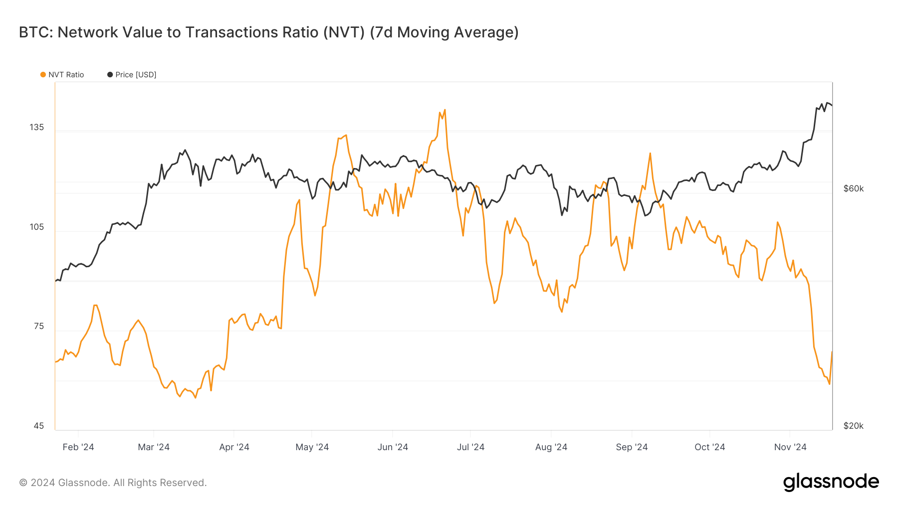 Rasio NVT (Network Value to Transactions), metrik penting untuk menganalisis harga Bitcoin, terpantau melonjak setelah sebelumnya mencapai level terendah 8 bulan. Rasio NVT yang rendah biasanya menunjukkan aktivitas transaksi jaringan sejalan dengan nilainya, menandakan pasar yang seimbang dan berkelanjutan.