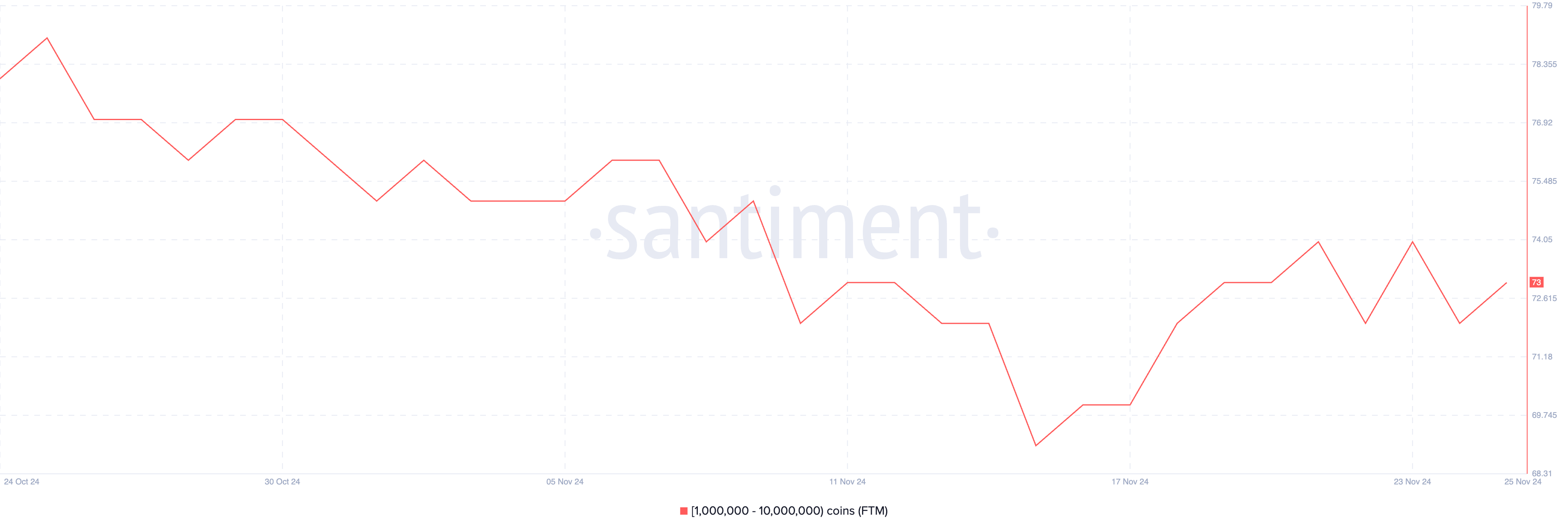 FTM whales nampaknya memperlambat akumulasi mereka setelah lonjakan aktivitas awal bulan ini. Jumlah dompet yang memegang antara 1.000.000 dan 10.000.000 FTM meningkat dari 69 pada 15 November menjadi 74 pada 21 November, menunjukkan peningkatan kepercayaan di antara holder besar selama periode tersebut.