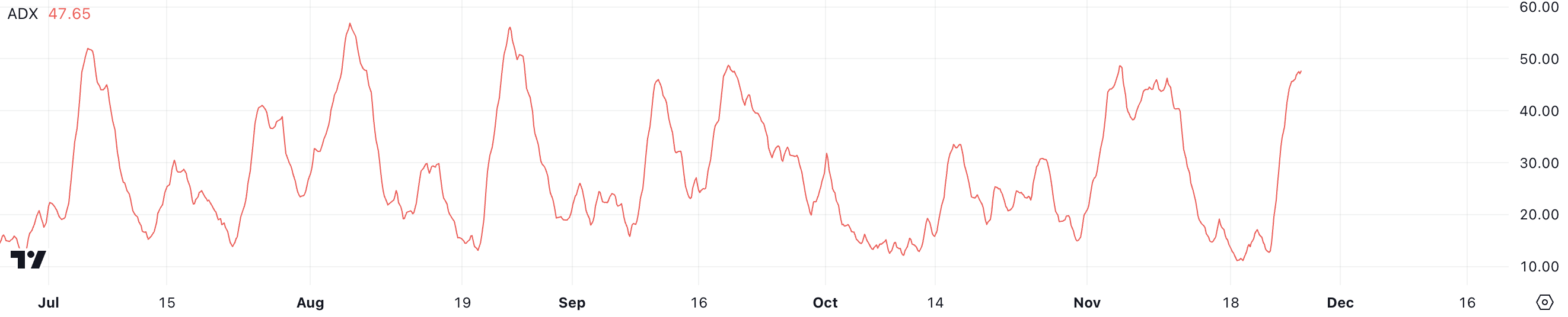 Meskipun ADX 47 sudah menandakan tren yang kuat, data historis menunjukkan ADX FTM bisa melebihi 50 selama periode momentum yang intens.