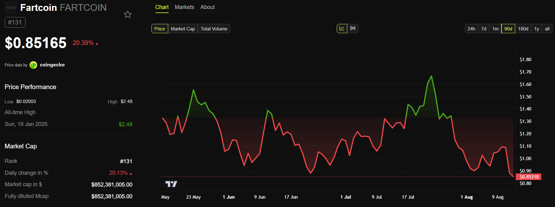 Data harga dari BeInCrypto menunjukkan bahwa FARTCOIN jatuh lebih dari 20% hari ini menjadi US$0,85 — level terendah dalam 90 hari terakhir.