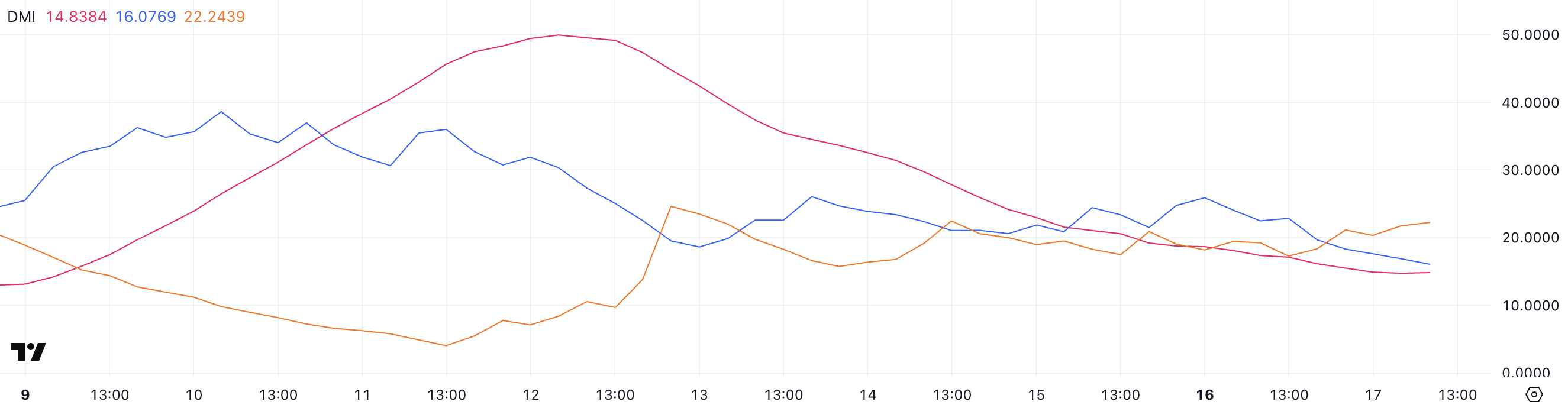 Directional Movement Index (DMI) FARTCOIN menunjukkan tanda-tanda jelas melemahnya kekuatan tren, dengan Average Directional Index (ADX) turun ke 14,83 dari 27,82 hanya tiga hari lalu.