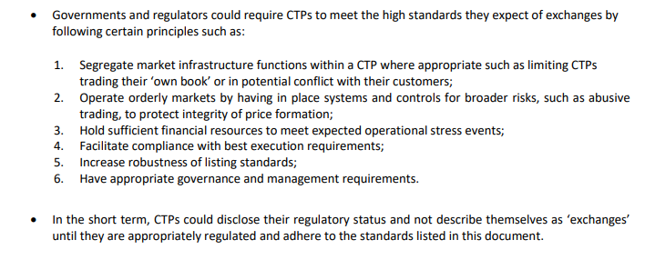 Federasi Bursa Dunia (WFE), yang menjadi wadah bagi bursa dan lembaga kliring untuk transaksi derivatif (CCP), mendorong platform perdagangan kripto (crypto trading platform / CTP) agar mengungkapkan status peraturannya dan tidak menggambarkan dirinya sebagai exchange. Hal tersebut perlu dilakukan untuk mereduksi risiko yang melekat dalam setiap aktivitas kripto.
