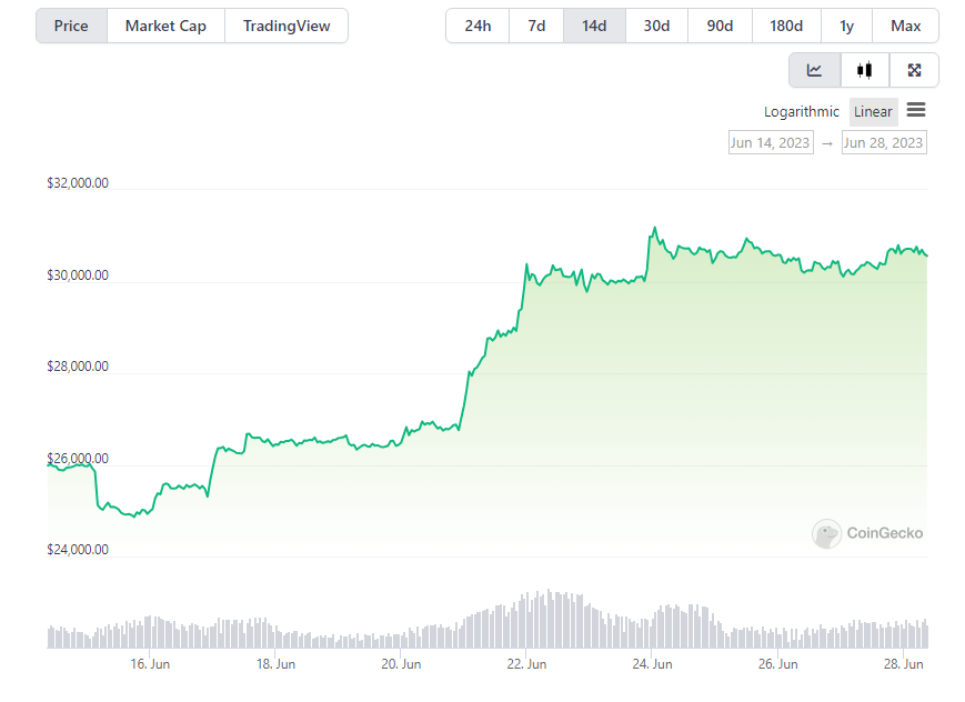 Hal tersebut pada akhirnya berpengaruh terhadap harga bitcoin. Pada perdagangan pagi ini (28/6), harga BTC sempat naik 1% dalam 24 jam terakhir. Bahkan, jika dilihat selama 2 pekan terakhir, sebelum BlackRock belum mengajukan berkas ETF Bitcoin Spot ke SEC, harga BTC sudah terapresiasi sebanyak 17%, dari US$25.985 di 14 Juni menjadi US$30.560 di perdagangan hari ini.