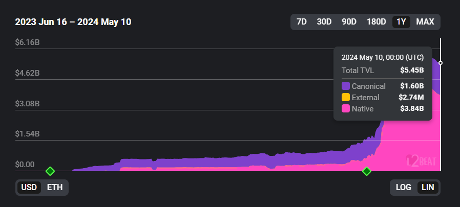 Apabila dibandingkan dengan solusi L2 lainnya seperti Arbitrum dan Optimism, Base telah menunjukkan pertumbuhan yang luar biasa. Data L2BEAT mengungkap bahwa total value locked (TVL) Base melonjak lebih dari 630% dari semula US$742,63 juta menjadi US$5,45 miliar secara year-to-date (YTD). Sementara itu, Arbitrum, solusi L2 teratas dengan TVL US$16,03 miliar, hanya mencatat kenaikan sekitar 47% selama periode waktu yang sama.