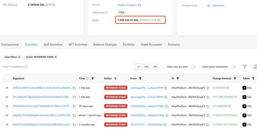 Meskipun telah terjadi transaksi tersebut, masih tersisa 7,06 juta SOL, bernilai US$945,7 juta, yang tetap di-stake.