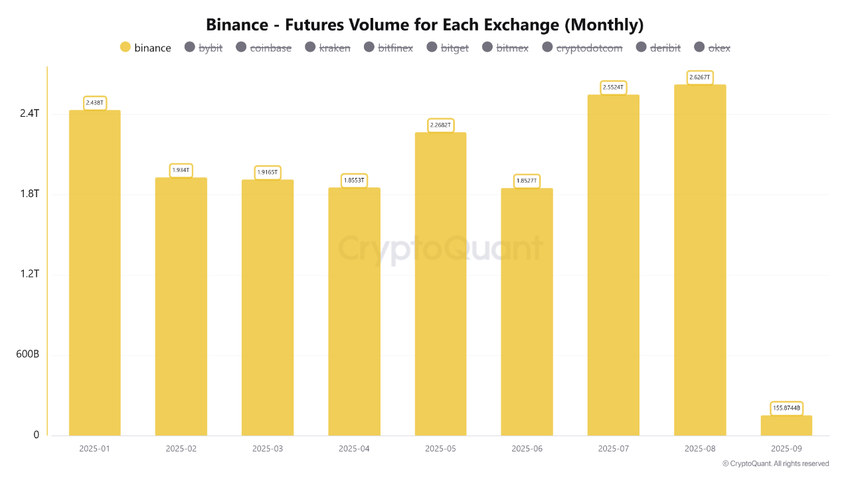 Menurut analis kripto Arab Chain, total volume futures Binance untuk Agustus mencapai US$2,626 triliun, tertinggi sepanjang masa untuk tahun 2025. Angka ini melampaui rekor sebelumnya sebesar US$2,552 triliun yang dicapai pada bulan Juli, mencerminkan kembalinya momentum pasar yang kuat dan masuknya modal baru. Analis tersebut menunjukkan likuiditas yang diperkuat di Binance, yang mengukuhkan posisinya sebagai pasar futures global yang dominan.