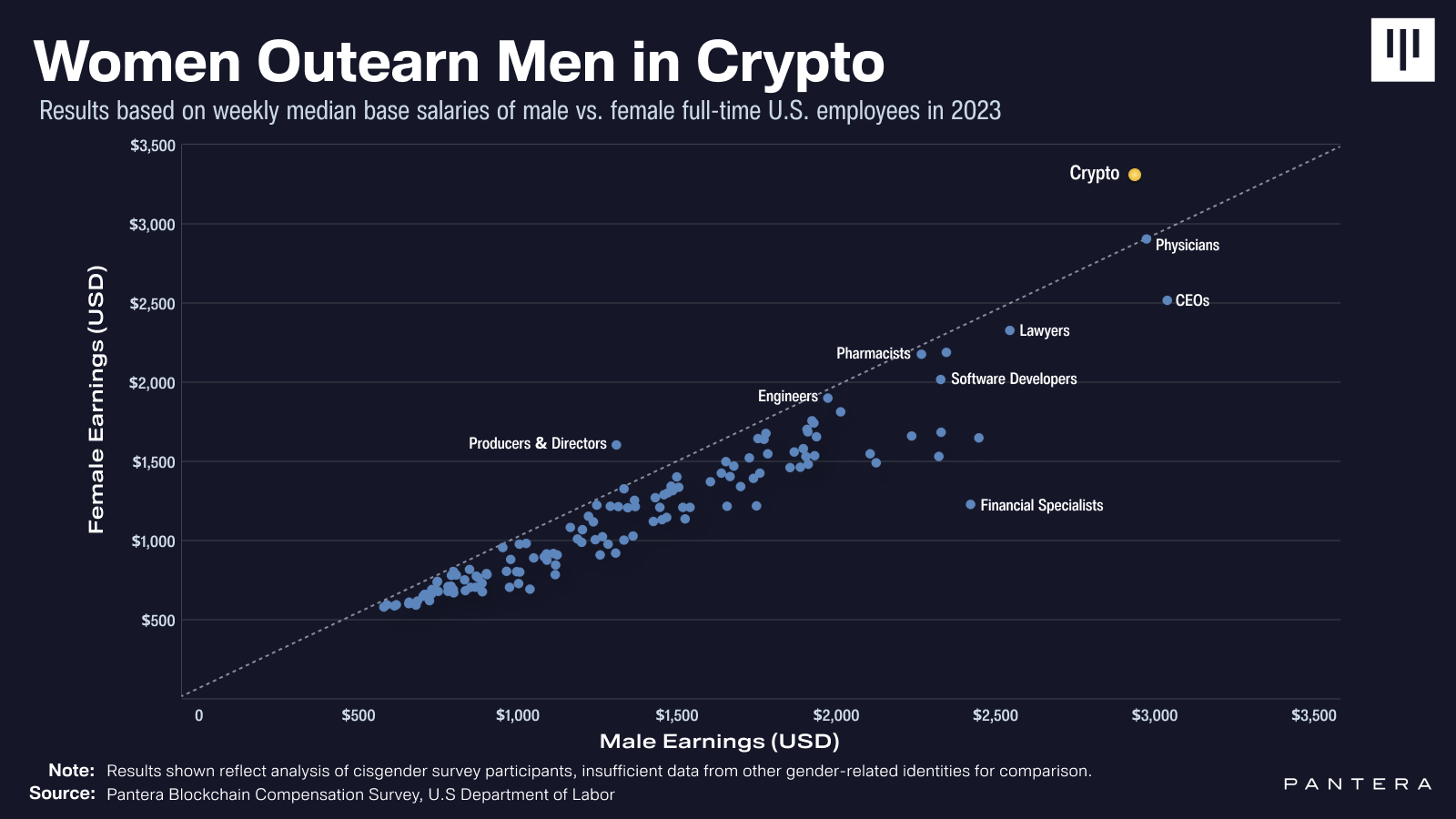 Dalam pandangan Pantera, kesenjangan upah terbalik kemungkinan menunjukkan bahwa kripto menawarkan peluang yang lebih baik bagi wanita dibanding industri tradisional. Selain itu, upah yang relatif adil juga memperlihatkan adanya pergerakan menuju kesetaraan gender yang lebih besar, menandai tren progresi dalam bidang baru ini.