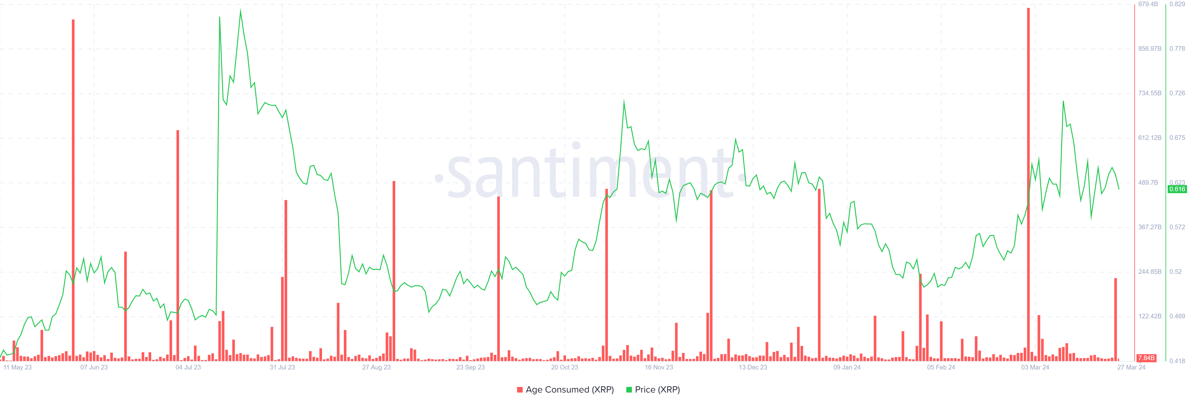 Adapun aksi mereka diamati melalui total usia yang terpakai ketika mereka memindahkan kepemilikan mereka antar alamat. Semakin tinggi lonjakannya, semakin besar pula jumlah token yang dipindahkan. Dalam kasus XRP sendiri, pergerakan mereka tidak sebesar kejadian di masa lalu. Walau begitu, ini adalah sinyal bahwa keyakinan dari para investor ini mulai surut.