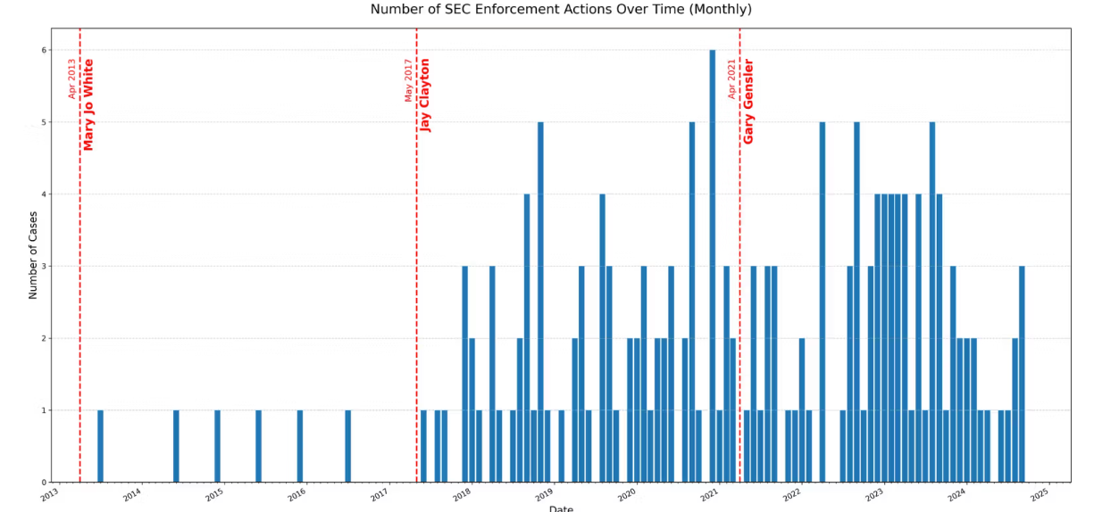 SEC di bawah Gensler telah mengejar tindakan penegakan profil tinggi terhadap perusahaan kripto besar, termasuk Binance, Coinbase, dan Ripple. Kritikus mengklaim strategi berat penegakan ini telah menghambat inovasi dan menciptakan hubungan yang bermusuhan antara regulator dan industri.