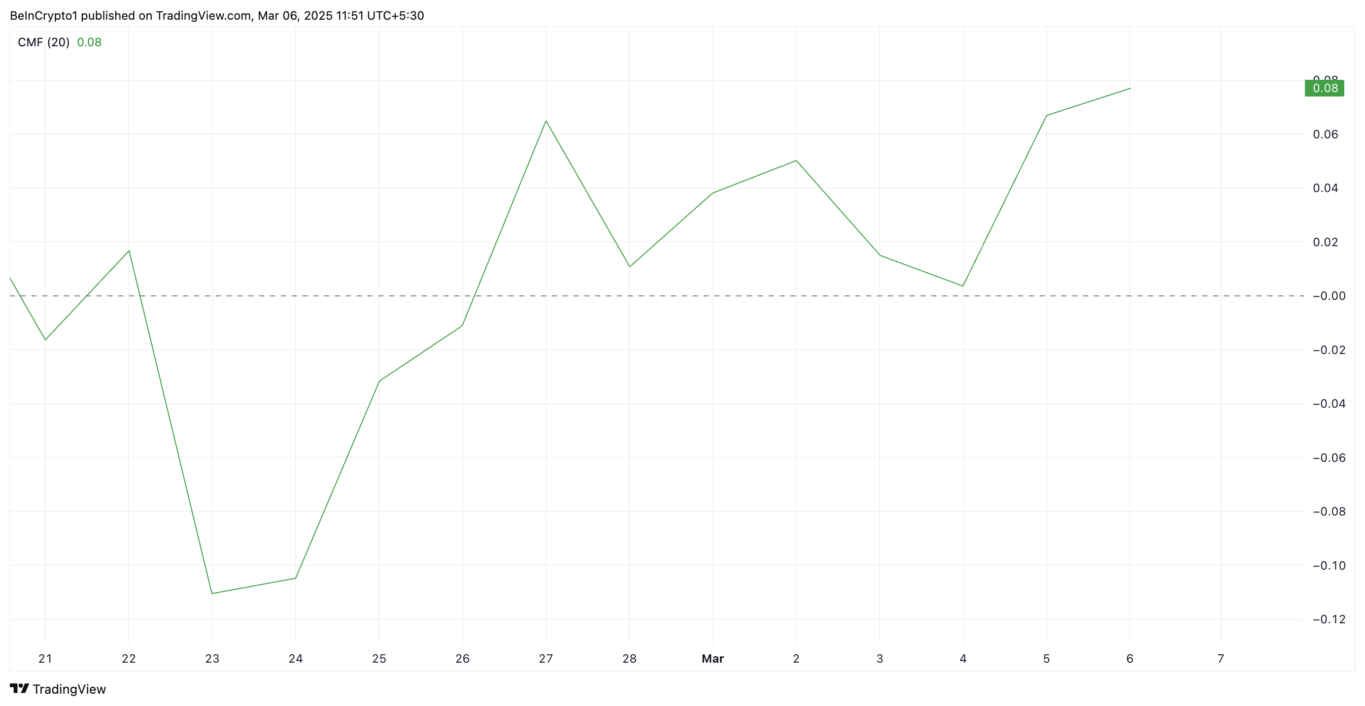 Bacaan dari grafik satu hari MOVE/USD menunjukkan kemungkinan reli yang lebih panjang seiring dengan meningkatnya permintaan baru. Misalnya, Chaikin Money Flow (CMF) yang meningkat mengonfirmasi permintaan yang meningkat untuk altcoin ini. Pada waktu publikasi, indikator momentum, yang mengukur aliran uang masuk dan keluar dari sebuah aset, berada di atas nol dan dalam tren naik di 0,09.