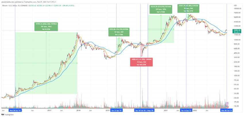 Golden cross yang sebelumnya terakhir kali muncul 510 hari yang lalu pada grafik Bitcoin, atau tepatnya pada 14 September 2021. Sinyal tersebut terbentuk setelah BTC mencapai level terendah US$29.000 pada musim panas 2021 dan kemudian mengalami rebound setelahnya. Setelah kemunculan sinyal itu, BTC akhirnya berhasil mengukir titik tertingginya sepanjang masa (ATH) saat ini. Titik ATH ini mencetak level US$69.000 pada 10 November 2021. Jika diukur dari golden cross sebelumnya hingga puncak absolut (absolute peak), artinya Bitcoin sudah mengalami lonjakan harga sebesar 45%.