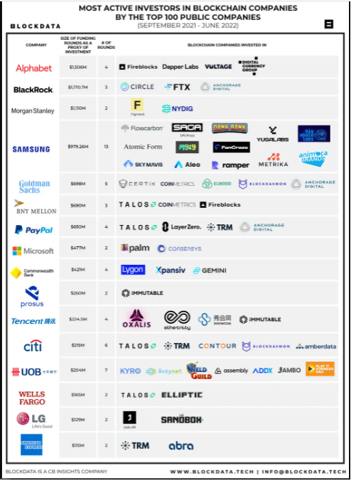 Adapun BlackRock merupakan perusahaan keuangan tradisional yang menduduki peringkat paling atas untuk total pendanaan bagi perusahaan berbasis blockchain. BlackRock sudah turut serta dalam putaran investasi dengan nilai total sebesar US$1,70 miliar. Perusahaan blockchain yang menjadi penerima pendanaan BlackRock adalah Circle, FTX, dan Anchorage Digital.