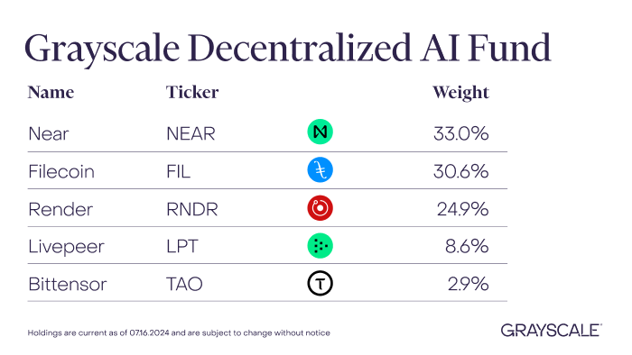 Grayscale Investments menciptakan dan meluncurkan reksa dana artificial intelligence (AI) terdesentralisasi, Grayscale Decentralized AI Fund LLC. Reksa dana ini menyertakan altcoin papan atas dan berfokus pada tiga kategori utama aset AI terdesentralisasi.
