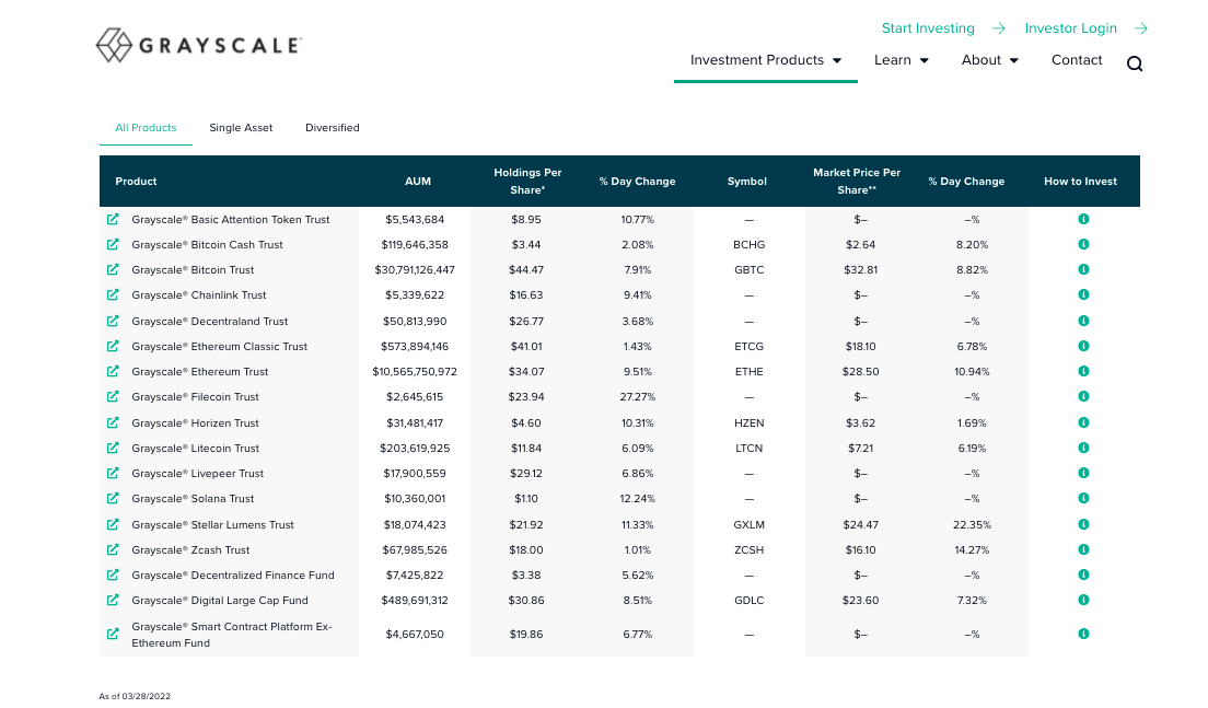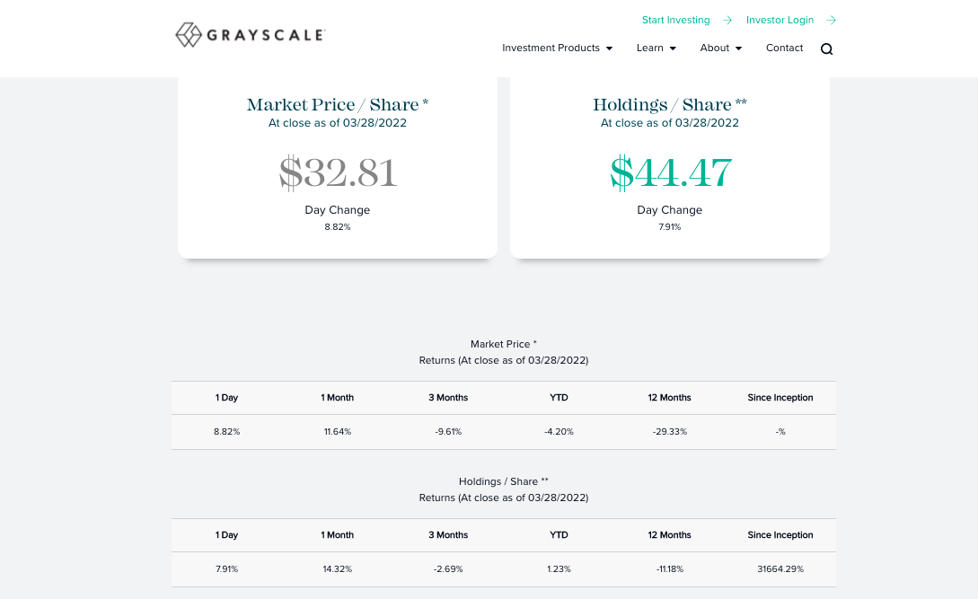 Per 28 Maret 2022, Grayscale melaporkan bahwa GBTC memiliki US$30,79 miliar dalam assets under management (AUM) atau aset yang mereka kelola. Sementara nilai kepemilikan aset Bitcoin per shares adalah US$32,81.